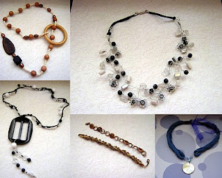 Amo farmi i bijoux da sola. Quando ho un' idea non sto in pace con me stessa fino a che non l' ho realizzata. La prima collana a sinistra, un saliscendi, l' ho realizzata smontando una collanina d' avorio molto semplice, ho aggiunto perle in legno, un anello per tende, un ciondolo in legno scuro. Per la collana nella foto grande ho usato fili di metallo, perle rettangolari in ceramica, a forma di fiore e palline nere. La terza collana ha il ciodolo realizzato con una fibbia della cinta di un cappotto, perle in vetro trasparente bianco, nere e cordoncino di alcantara nero. I 2 braccialetti sono fatti uno con tecnica peyote e l' altro con dei bottoncini che ho comprato in montagna (in legno con stelle alpine) uniti insieme da anelli di alluminio. L' ultima collana è un kit DMC Desire.