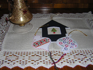 a Barbara ho regalato una cornice a forma di casetta con ricamato un alberello di Natale. A Monica e Sabrina ho ricamato due decorazioni da appendere a forma di palline per l' albero. I supporti di carta traforata sui quali ho ricamato sono della Token and Trifle. E' stato un po' difficoltoso ma sono molto soddisfatta del risultato.