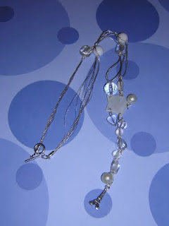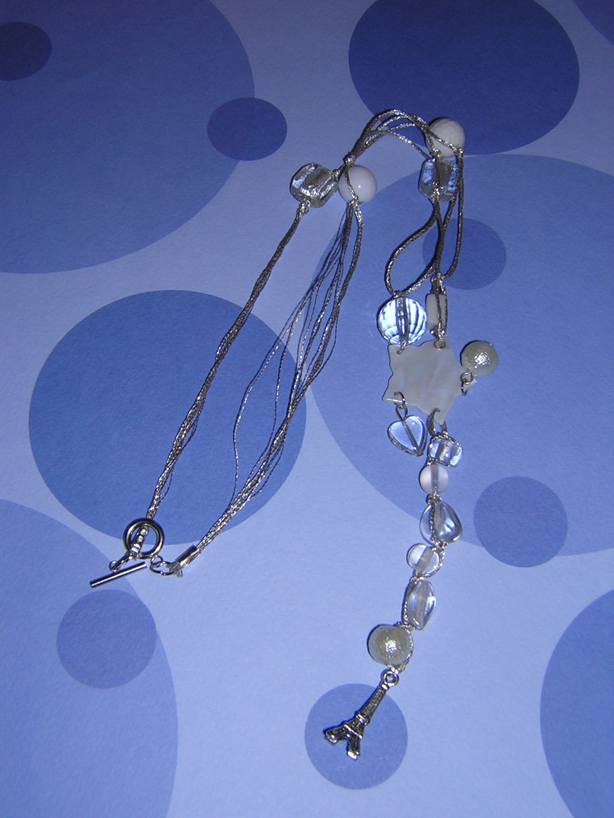 La mia amica Simona Mani di Donna che è andata a L' aiguille en fete a Parigi, mi ha portato un regalino, la Torre Eiffel formato ciondolo con la quale ho fatto subito una collanina. Il modello l' preso da un piccolo libro che la DMC ha pubblicato per la bigiotteria con il filo Desire.