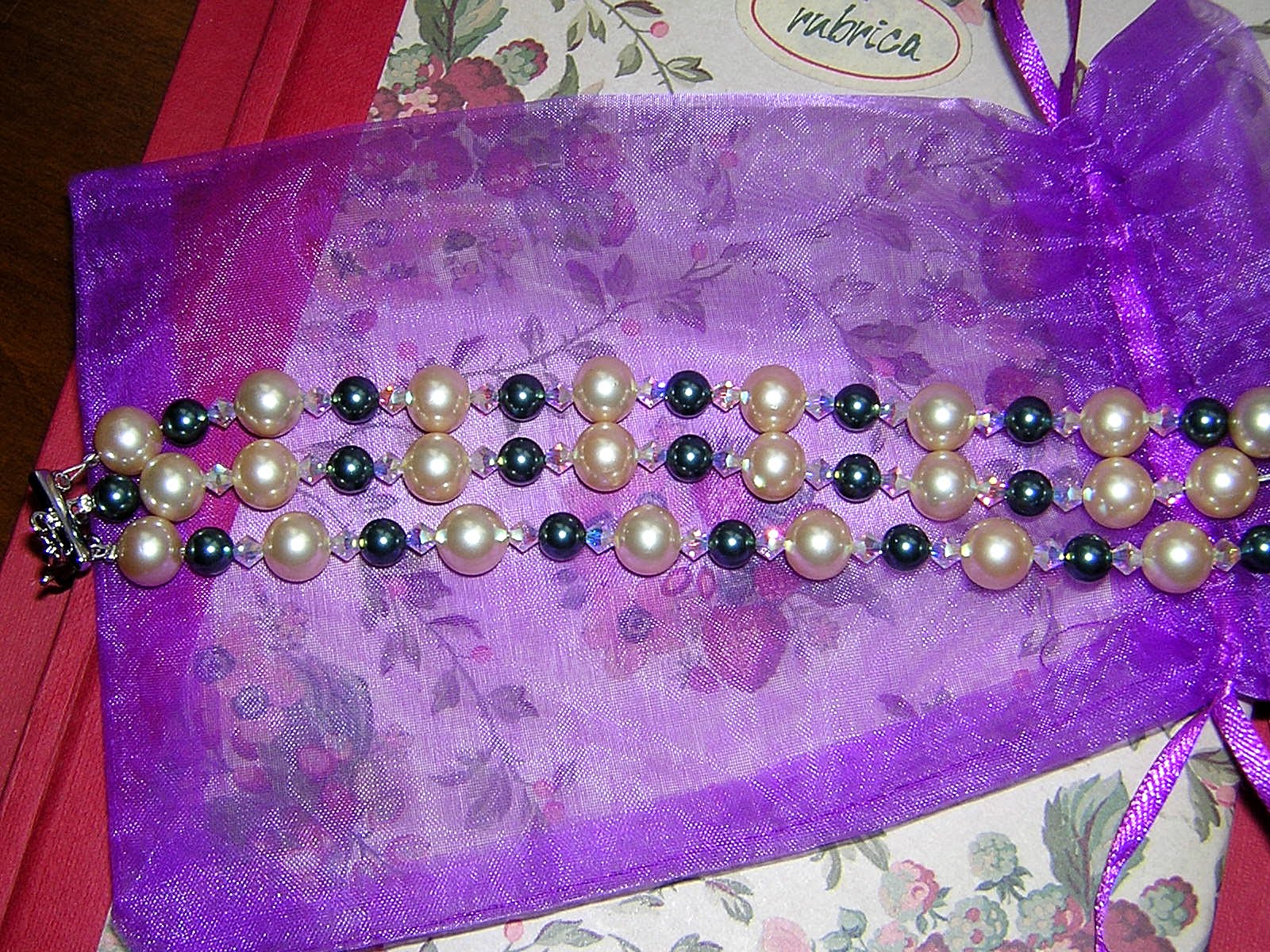 Tempo fa ho messo in ordine un cassetto e ho scoperto di avere ben 7 collane di perle. Le ho portate dal mio orefice di fiducia, ne ho fatto unire tre e ci ho fatto fare una collana lunghissima (tipo le collane degli anni '20). Con alcune perle l' oreficie ha realizzato degli orecchini a cerchio con pendente e comunque sono avanzate altre perle. Avevo visto su una rivista un bracciale simile a questo ma, insieme alle perle c' erano anche delle perline d' argento. La spesa per la realizzazione era alta e l' orefice mi suggerito di cercare a casa delle collane con pietre dure da disfare e riassemblare per fare questo bracciale. Non avendo la collana di pietre dure sono andata al negozio della mia amica Azzurra e ho comprato delle perle Swarorski blu scuro, dei cristalli sw. trasparenti, la chiusura e così