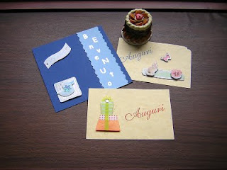 Lo sapete ormai che mi piace realizzare biglietti d' auguri di qualsiasi genere. Ne ho realizzati 3. Quello blu è per un bambino nato da poco, quello con il coniglietto e la farfalle è per una mia collega e quello con i pacchetti regalo è per mia una cugina.